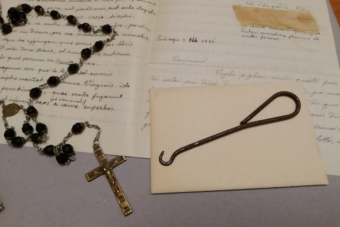 Nel fascicolo di fratel Luigi Sartirana è stato rinvenuto uno strano oggetto: una sorta di gancio a forma di “S” che si è rivelato essere un “buttonhook” attrezzo utilizzato per chiudere i bottoncini degli stivaletti in uso tra la fine dell’Ottocento ed i primi anni del Novecento.