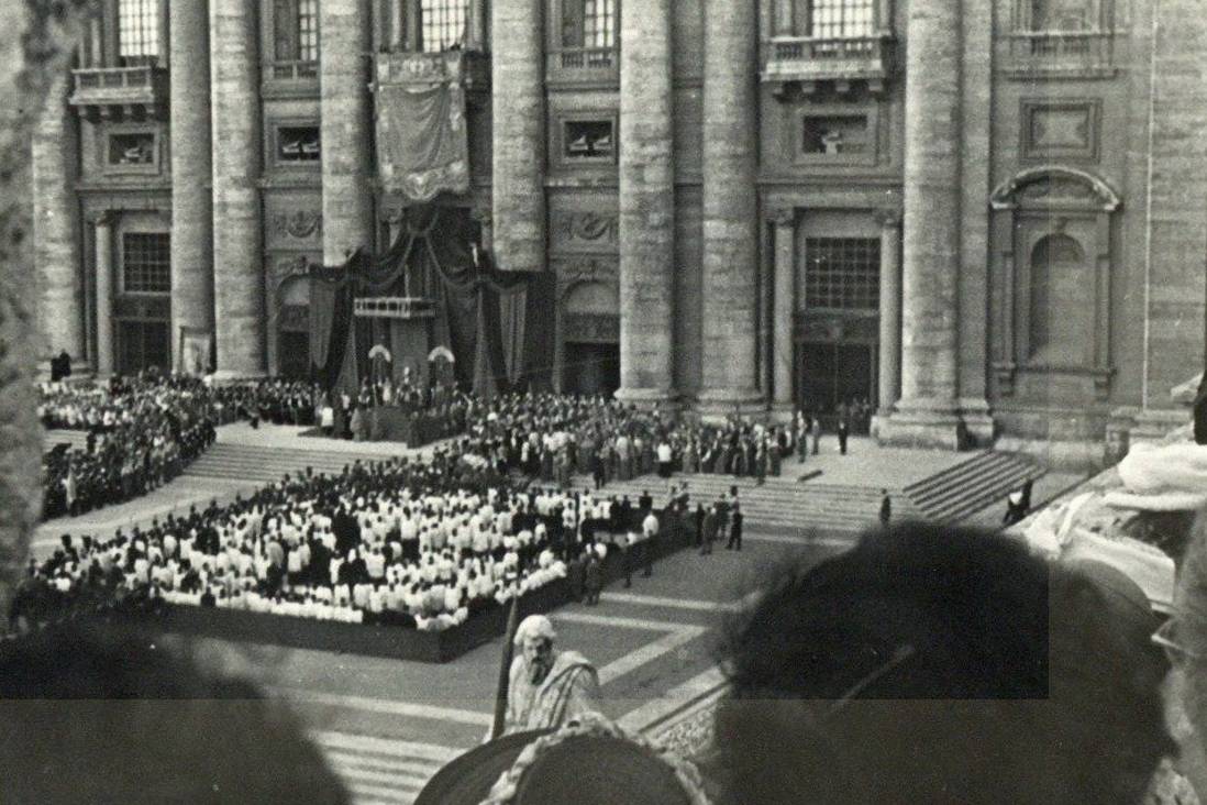 Nella serie fotografica dell’istituto Massimiliano Massimo, recentemente riordinata, troviamo diverse foto scattate in occasione di alcuni giubilei: quello straordinario del 1933 e quello ordinario del 1950. Ecco una piccola galleria delle foto risalenti a quegli anni. Ritraggono gli allievi dell’istituto, in divisa bianca, sfilare per le strade di Roma, con il cartello “Istituto Massimo” fino a S. Pietro. Le fotografie mostrano anche le Basiliche che visitano, illuminate a festa.